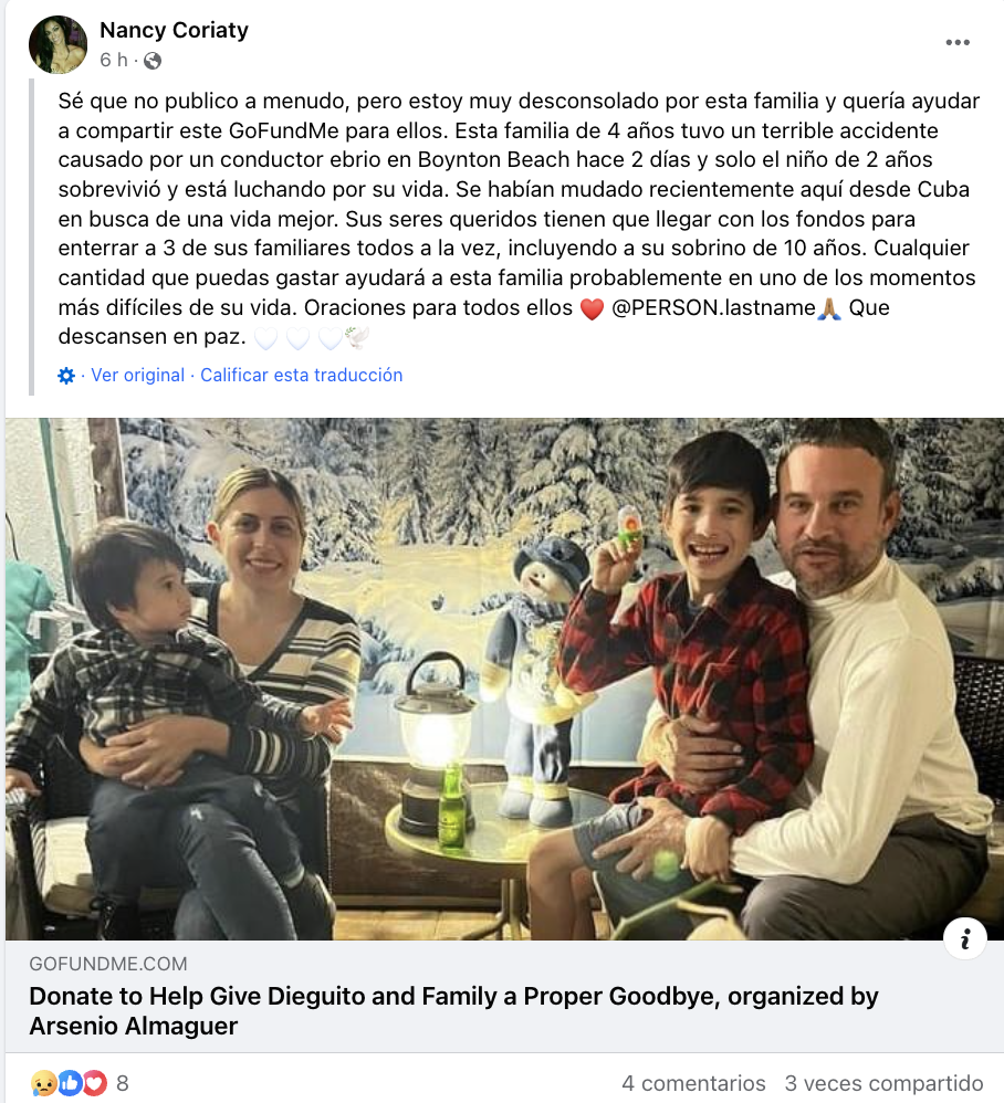 A través de las redes sociales familiares y amigos de esta familia han lamentado este fatídico suceso, al tiempo que pidieron ayuda económica por medio de la plataforma GoFundMe para recaudar fondos con el fin de hacerle un funeral “honorable” a estos cubanos que como otros millones, salieron de la isla en busca de un mejor futuro lejos del comunismo.
