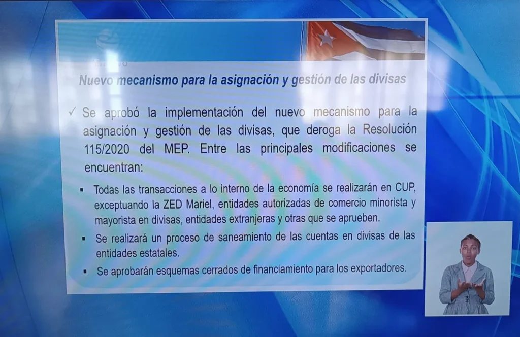 La televisión estatal cubana reportó que el gobierno también aprobó un nuevo mecanismo para la gestión y asignación de divisas, derogando la Resolución 115/2020, que había sido firmada por el exministro Alejandro Gil, descrito como “corrupto” por fuentes oficiales. Este nuevo esquema permitirá un “proceso de saneamiento” de las cuentas estatales y establecerá “esquemas cerrados” para la gestión de exportaciones.