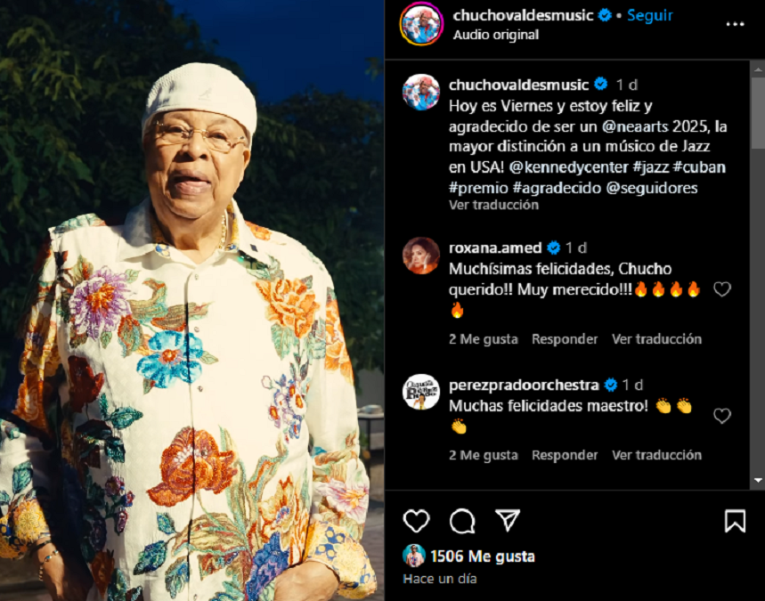 En un vídeo publicado recientemente en sus redes sociales, Chucho Valdés expresó su emoción y gratitud por el reconocimiento. “Estoy feliz y agradecido de ser un @neaarts 2025, la mayor distinción a un músico de Jazz en USA”, comentó. Las felicitaciones de colegas y seguidores de todo el mundo no se hicieron esperar.
