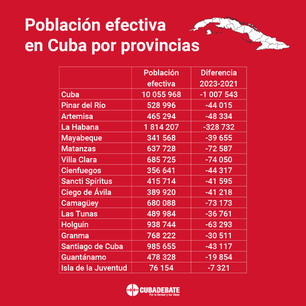 En ese sentido Alfonso, afirmó que si se considera a los cubanos que emigraron, pero aún mantienen su residencia en la isla, dado que pasan parte del año en la nación o porque han solicitado una prórroga desde el extranjero, de esa forma el dato se elevaría a poco más de los 10.05 millones de cubanos hasta 2023.