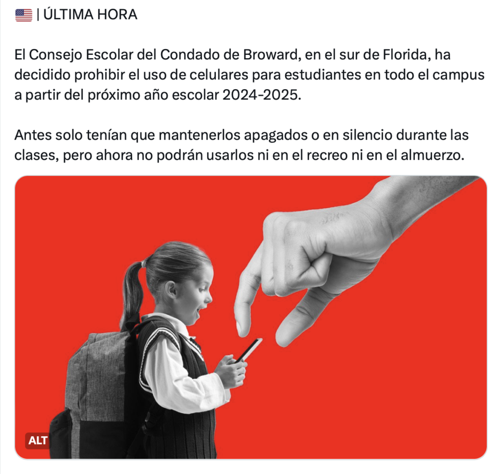 Esta regla entrará en vigor a partir del 12 de agosto, cuando inicia el nuevo año escolar en Broward, los estudiantes de todos los grados tendrán que guardar el celular y ponerlos en modo avión.