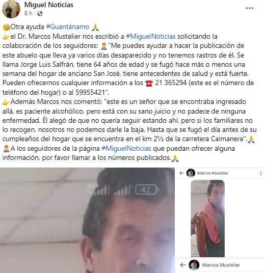 El hogar se encuentra ubicado en el kilómetro 2½ de la carretera Caimanera, y se solicita a cualquier persona que tenga información llamara a los números 21 365294, del hogar, o al 59955421.