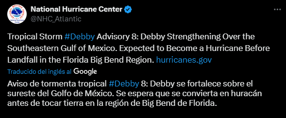 En el mismo orden de ideas, el NHC pronosticó que Debby continuaría su rumbo, realizando un giro hacia el norte el domingo, seguido de una dirección noreste durante la noche.