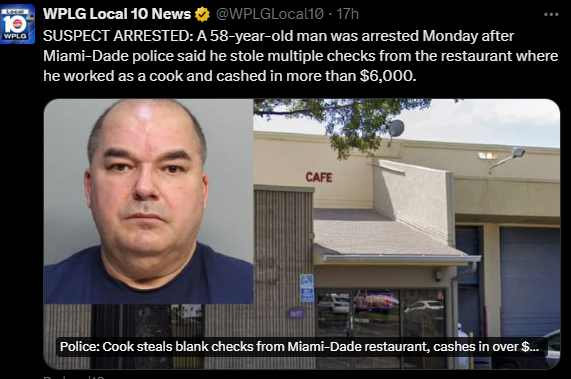 En Miami, Luis Alberto Milian, un cocinero cubano de 58 años, fue arrestado por la policía tras ser acusado de haber robado cheques de su lugar de trabajo.