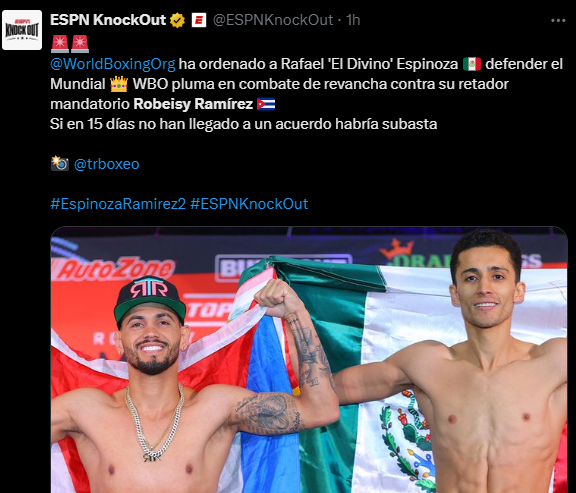 La Organización Mundial de Boxeo emitió recientemente la orden que indica que el cubano Robeisy Ramírez y Rafael ‘El Divino’ Espinoza, tendrán que llevar a cabo una nueva pelea.