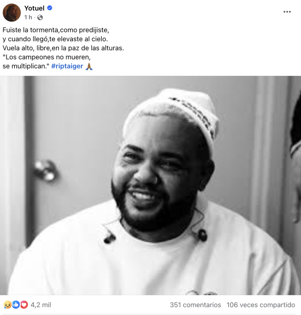 La Diosa de Cuba, Alexander Delgado y Randy Malcom de Gente de Zona, Yulien Oviedo, Leoni Torres, El Chacal, Yotuel, entre otros, han escrito sensibles palabras por el fallecimiento de El Taiger en sus redes sociales.