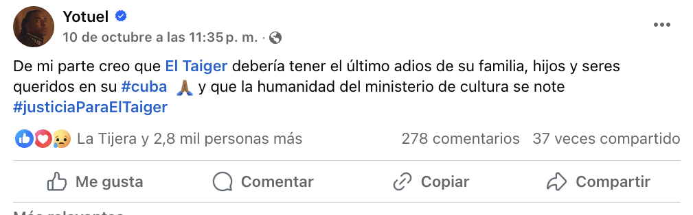 “De mi parte creo que El Taiger debería tener el último adiós de su familia, hijos y seres queridos en su #Cuba y que la humanidad del ministerio de cultura se note #justiciaParaElTaiger”, escribió Yotuel en un post en Facebook en los últimos días.