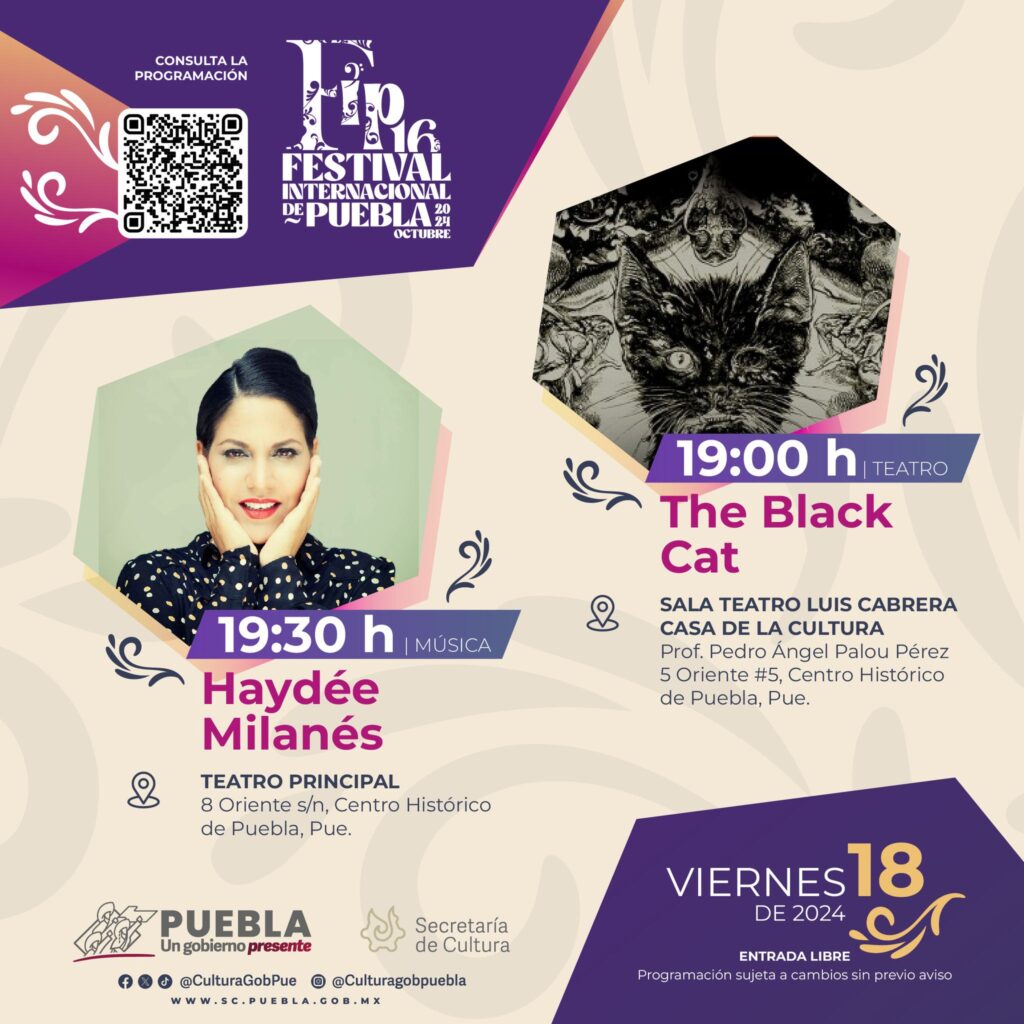 El Festival Internacional de Puebla (FIP) 2024 arrancará hoy, viernes 18 de octubre, y entre los eventos más esperados está el concierto de la cantante cubana Haydée Milanés en el Teatro Principal a las 19:30 horas.