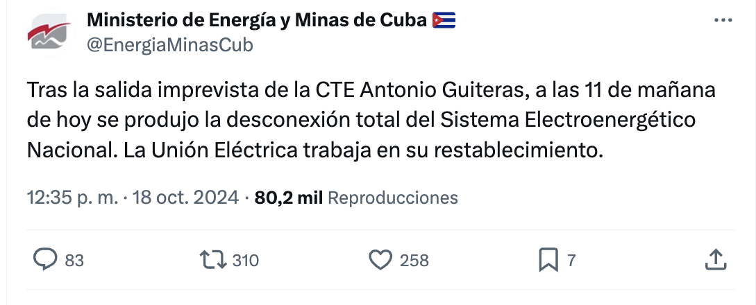 “Tras la salida imprevista de la CTE Antonio Guiteras, a las 11 de mañana de hoy se produjo la desconexión total del Sistema Electroenergético Nacional. La Unión Eléctrica trabaja en su restablecimiento”, indicó el ministerio castrista a través de la red social X (antes Twitter).