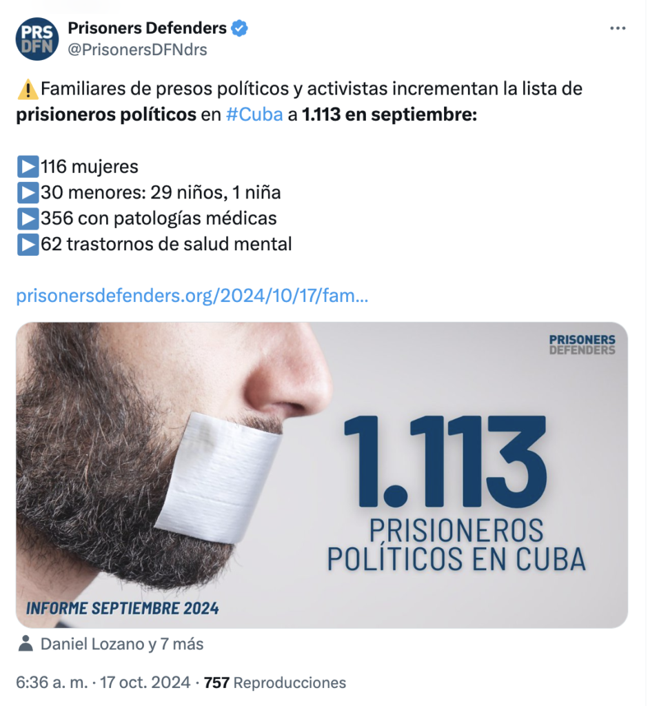 Asimismo, Prisoners Defenders apuntó que en agosto se reportaron un total de 1 mil 105 presos políticos en Cuba, por lo que en septiembre se contabilizan 13 personas más encarceladas por razones políticas.