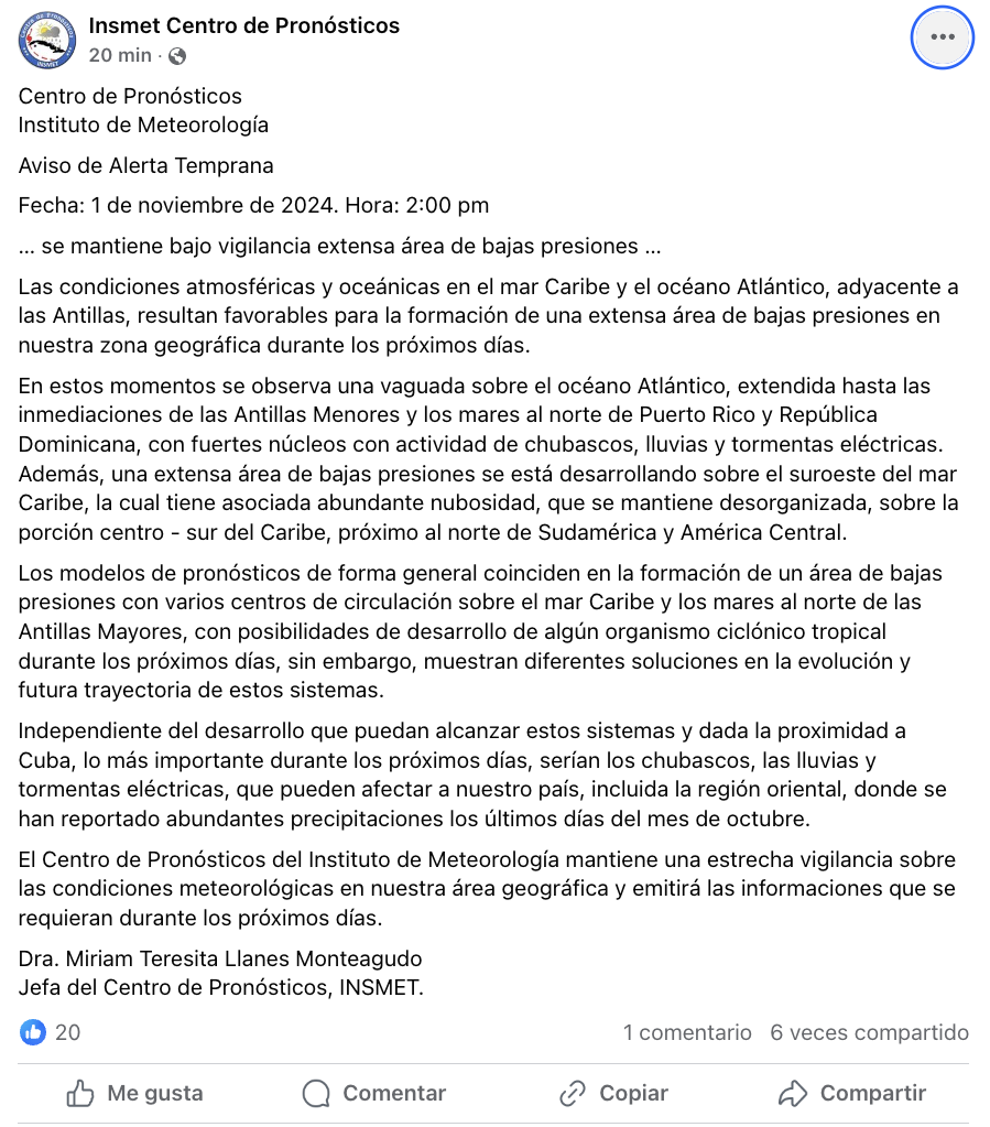 “Es posible un desarrollo de este sistema durante los próximos días a medida que se mueve hacia el oeste-noroeste cerca de las Antillas Mayores. Después de ese tiempo, se espera que este sistema se absorba por el área de baja presión que se localiza sobre el mar Caribe”, añadió el INSMET.