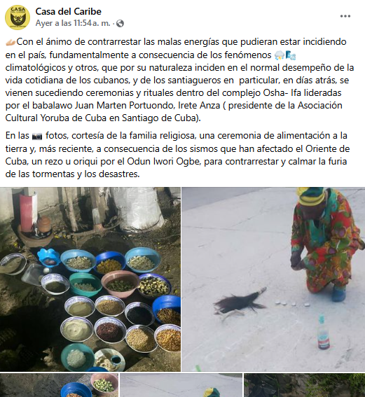 “Con el ánimo de contrarrestar las malas energías que pudieran estar incidiendo en el país, fundamentalmente a consecuencia de los fenómenos climatológicos y otros (…) se vienen sucediendo ceremonias y rituales dentro del complejo Osha- Ifa lideradas por el babalawo Juan Marten Portuondo, Irete Anza ( presidente de la Asociación Cultural Yoruba de Cuba en Santiago de Cuba)”, se lee en la publicación.