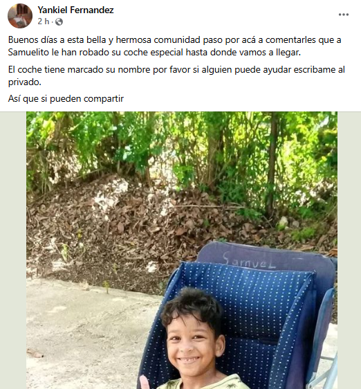 “Buenos días a esta bella y hermosa comunidad, paso por acá a comentarles que a Samuelito le han robado su coche especial, ¿hasta dónde vamos a llegar?”, escribió Fernández, haciendo un llamado urgente a la solidaridad de los ciudadanos.