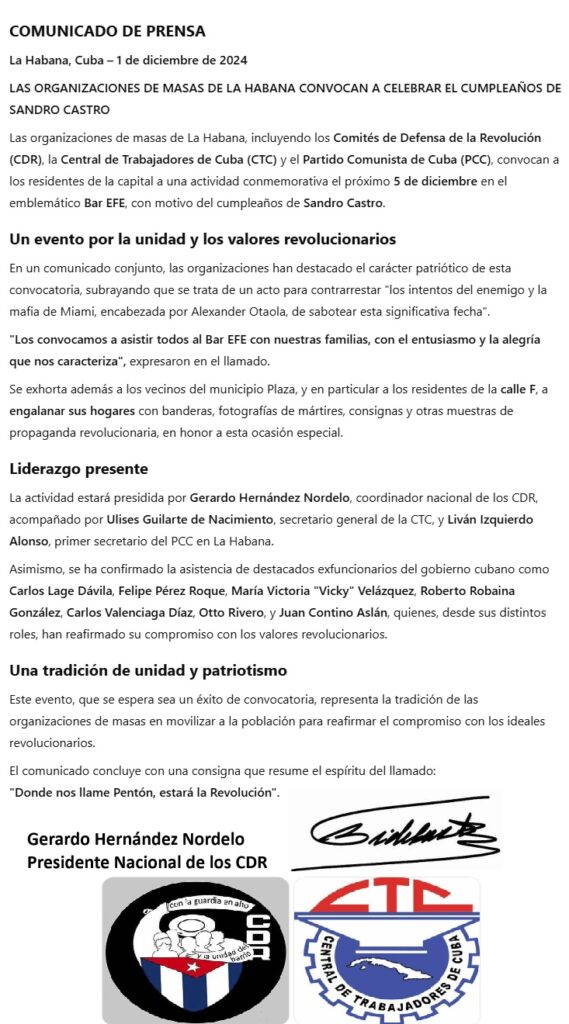 Las organizaciones de masas de La Habana, incluyendo los Comités de Defensa de la Revolución (CDR), la Central de Trabajadores de Cuba (CTC) y el Partido Comunista de Cuba (PCC), han hecho un llamado para convocar a todos los ciudadanos residentes en la capital del país, a celebrar el cumpleaños de Sandro Castro el próximo 5 de diciembre en el Bar EFE. El llamado insta a los habaneros a participar en familia, destacando que el objetivo de la convocatoria es “echar por tierra los intentos del enemigo y la mafia de Miami, encabezada por Alexander Otaola, en destruir la celebración de tan magna fecha patria”.