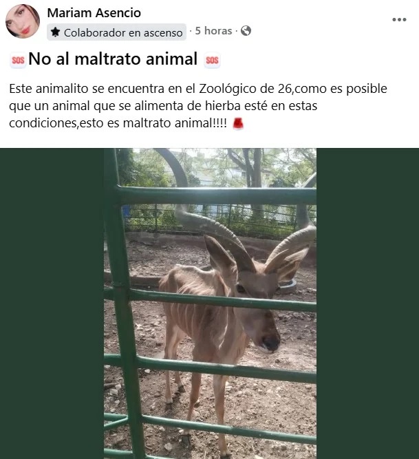 En esta oportunidad, en las redes sociales se hizo publica una denuncia de Mariam Asencio en el grupo “Sociedad protectora de animales en Cuba”, donde escribió sobre el estado actual de un antílope en ese lugar.