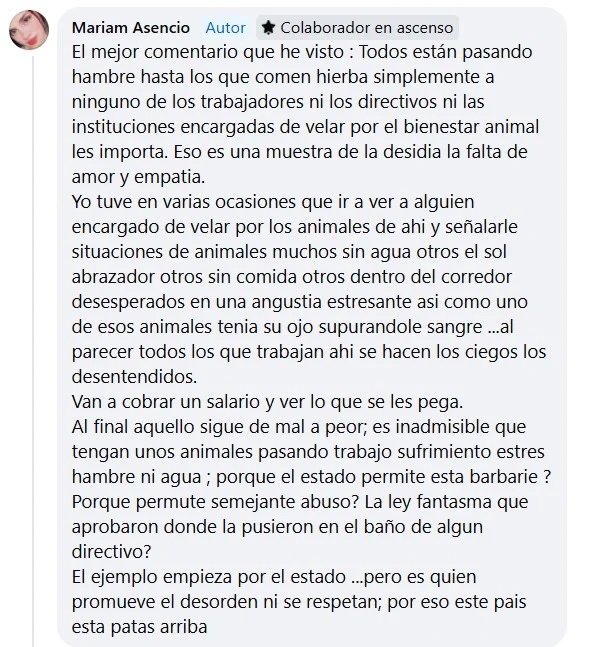 “Todos están pasando hambre, hasta los que comen hierba. Simplemente, a ninguno de los trabajadores, directivos ni instituciones encargadas de velar por el bienestar animal les importa”, escribió.