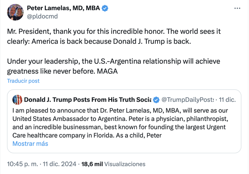El médico cubanoamericano Peter Lamelas fue designado por el presidente electo, Donald Trump, para el cargo de embajador de Estados Unidos en Argentina.