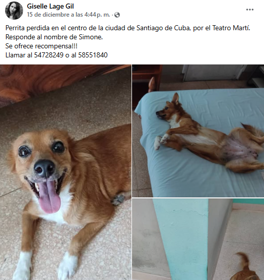 “Perrita perdida en el centro de la ciudad de Santiago de Cuba, por el Teatro Martí. Responde al nombre de Simone. Se ofrece recompensa”, escribió en su perfil de Facebook.