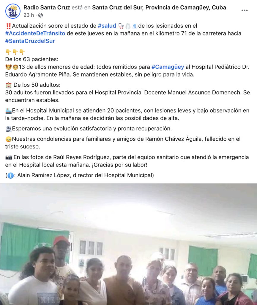 Un total de 63 personas lesionadas, entre esas, varios menores de edad, y un fallecido, dejó el trágico accidente masivo registrado en la carretera que conecta a Camagüey con Santa Cruz del Sur.