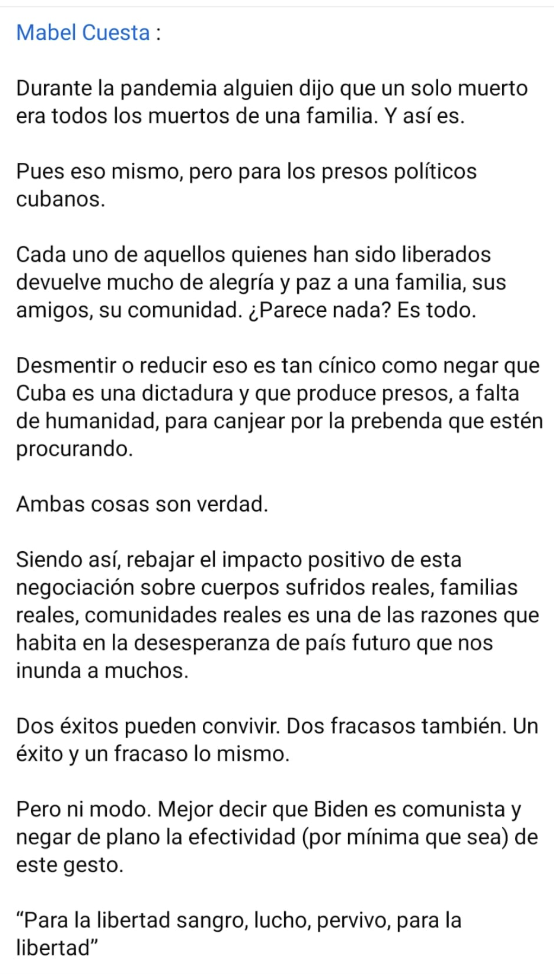 Reacciones más “reflexivas” fueron vistas en otros perfiles, como el de Mabel Cuesta. La profesora universitaria subrayó la importancia de valorar los logros parciales en la liberación de presos, destacando que cada excarcelación representa una esperanza para familias y comunidades enteras.