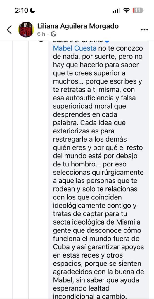 Según Chirino, Mabel Cuesta “se cree superior a muchos” y selecciona “quirúrgicamente” a las personas que la rodean, asegurándose de que coincidan ideológicamente con ella. Esta actitud, lejos de construir puentes, levanta barreras dentro de una comunidad que debería estar unida por objetivos comunes. Chirino señala además que su ayuda viene con expectativas de lealtad incondicional, lo que la aleja de un verdadero compromiso pluralista.