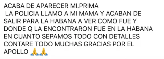“Acaba de aparecer mi prima. La policía llamó a mi mamá y acaban de salir para La Habana a ver cómo fue y dónde la encontraron. Fue en La Habana. En cuanto sepamos todo con detalles contaré todo. Muchas gracias por el apoyo”, fueron sus palabras.