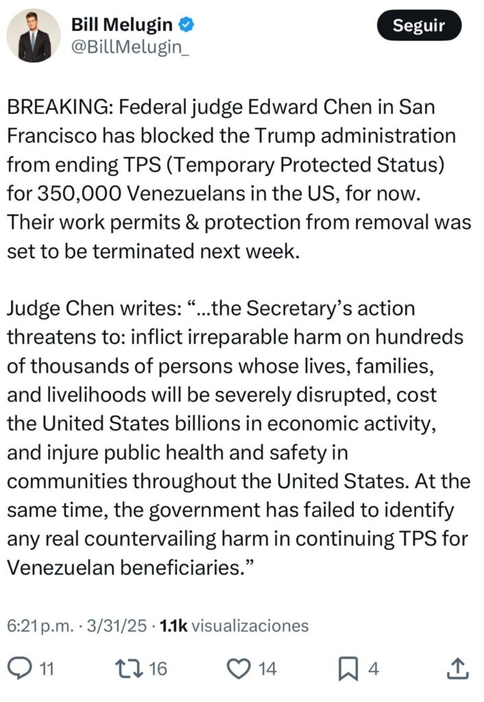 La decisión del juez Chen responde a una demanda presentada por la “Alianza Nacional del TPS” y varios beneficiarios venezolanos del programa, quienes argumentaron que la cancelación del TPS causaría “daños irreparables” a los afectados y tendría un impacto negativo en la economía estadounidense.