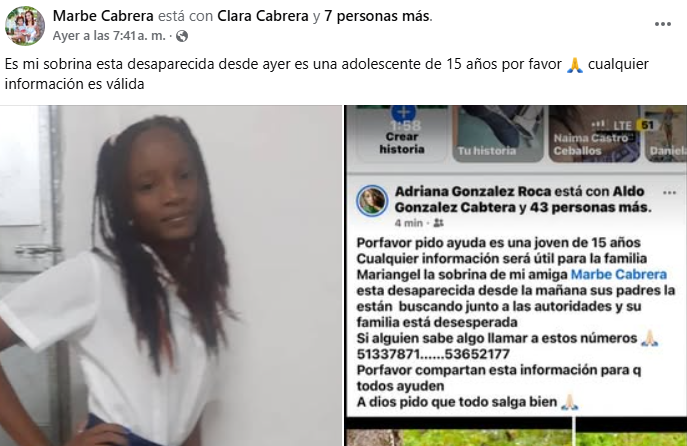 En plataformas como Facebook, circulan imágenes de Mariangel junto con mensajes que instan a la comunidad a colaborar con cualquier pista que pueda llevar a su paradero.