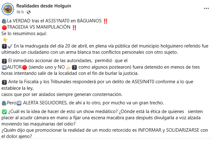 Según el medio oficialista Realidades desde Holguín, el crimen ocurrió en una calle del municipio y tuvo como trasfondo rencillas personales entre el fallecido y su agresor.