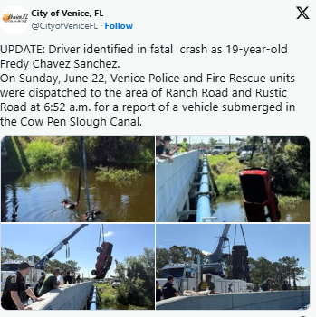 Un joven guatemalteco de 19 años perdió la vida la mañana del 22 de junio en Venice, Florida, tras caer con su camioneta al canal Cow Pen Slough, ubicado a unos 110 kilómetros al sur de Tampa.
