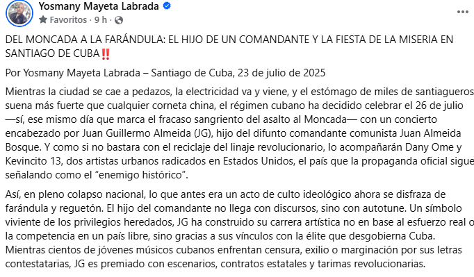 “Santiago no necesita conciertos: necesita agua, pan, electricidad, libertad y justicia. Lo demás —sobre todo cuando viene de los hijos de los verdugos— es ruido. Ruido para tapar el temblor de un país al borde del derrumbe”, aseveró Mayeta.