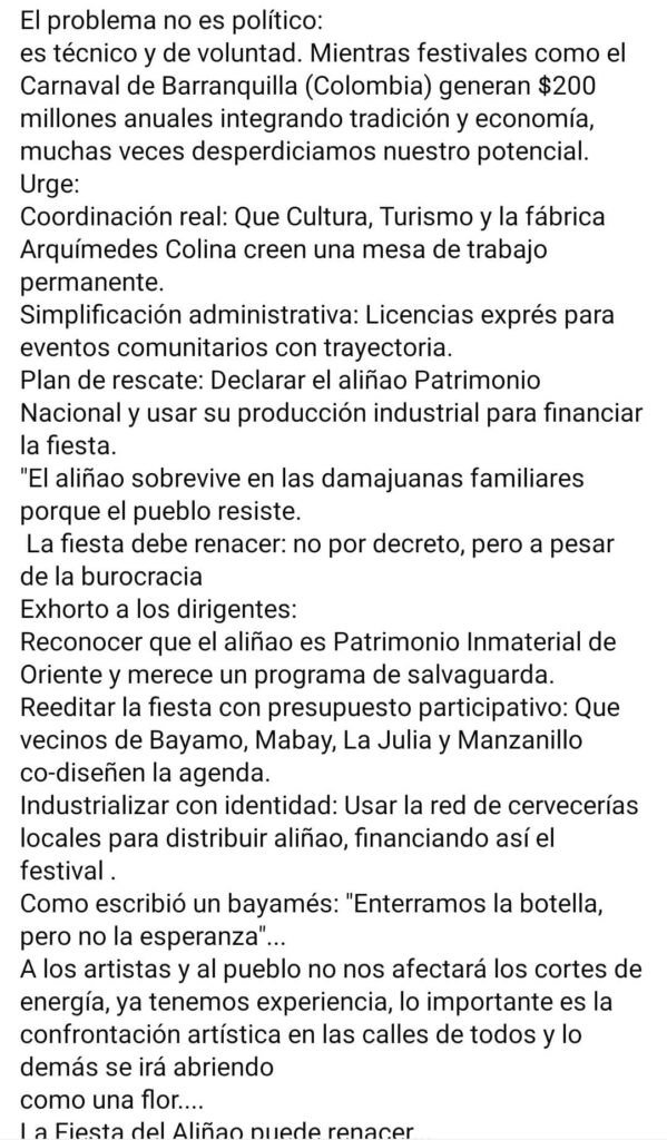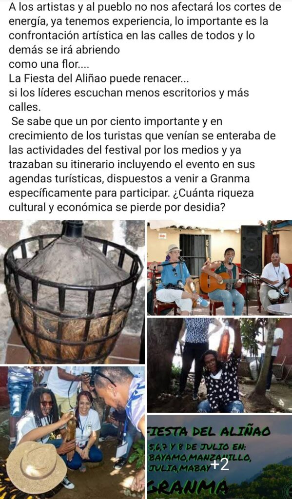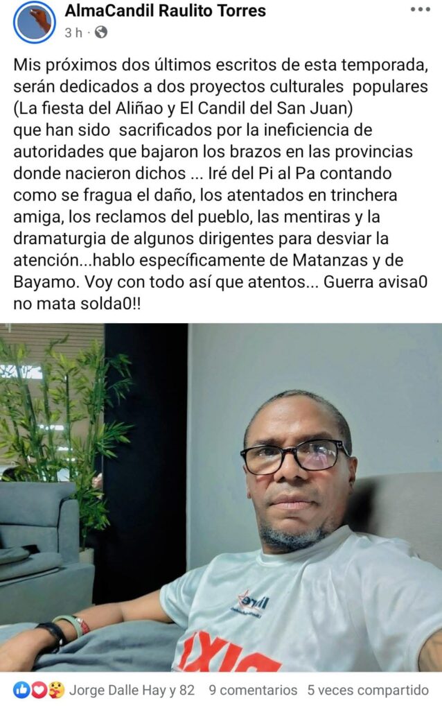 Torres, quien ultimamente está que araña un peso por donde sea, se quejó públicamente de que dos proyectos culturales suyos, la Fiesta del Aliñao y El Candil de San Juan, habían sido “sacrificados por la ineficiencia de las autoridades que bajaron los brazos en las provincias donde nacieron (…)” y prometió contar “del Pi al Pa como se fragua el daño, los atentados en trinchera amiga, los reclamos del pueblo, las mentiras y la dramaturgia de algunos dirigentes (…)” al tiempo que prometía arremeter contra los dirigentes de Matanzas y Bayamo.