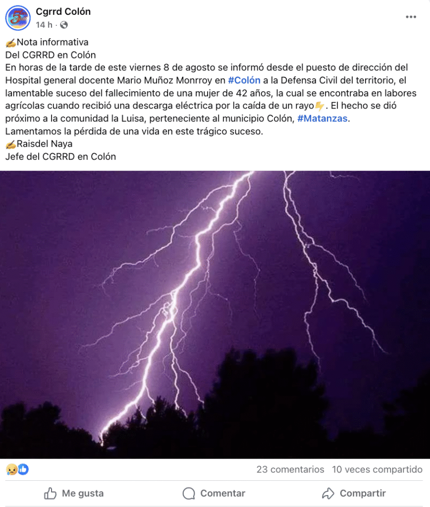 “En horas de la tarde de este viernes 8 de agosto se informó desde el puesto de dirección del Hospital general docente Mario Muñoz Monrroy en Colón a la Defensa Civil del territorio, el lamentable suceso del fallecimiento de una mujer de 42 años, la cual se encontraba en labores agrícolas cuando recibió una descarga eléctrica por la caída de un rayo”, afirmó.