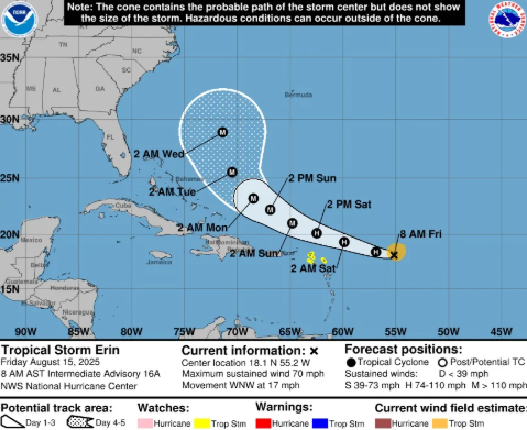 El Centro Nacional de Huracanes (NHC) de Estados Unidos informó que Erin, ubicada a unos 1.270 km al este de las Islas de Sotavento, avanza hacia el oeste a 28 km/h con vientos sostenidos de 95 km/h.