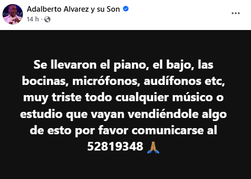 El joven músico, quien asumió la dirección tras el fallecimiento de su padre, Adalberto Álvarez, solicitó ayuda a través de las redes sociales para localizar el equipo y ofreció una recompensa a cambio de información.