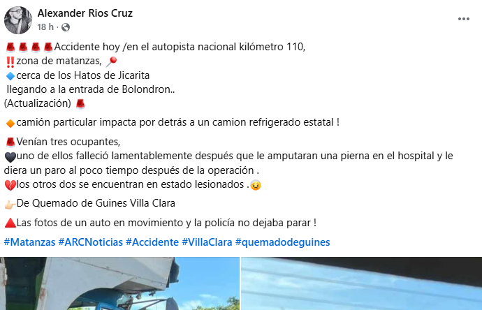 El suceso aconteció en el kilómetro 110 de la mencionada vía, dentro de la jurisdicción de Matanzas, cuando el vehículo en el que viajaban los tres individuos colisionó contra la estructura de un camión refrigerado de propiedad estatal.