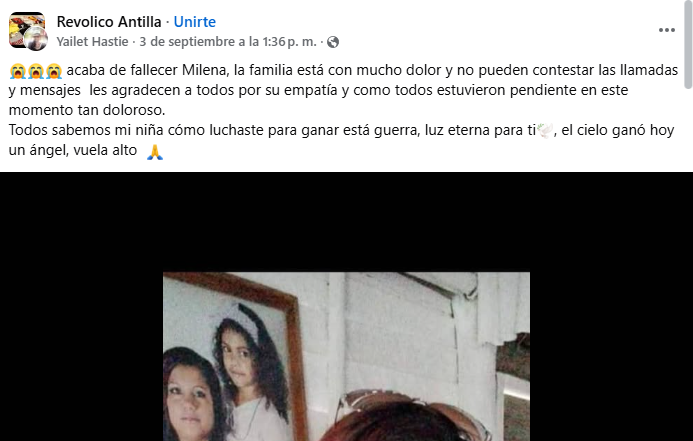 La noticia se propagó a través de la plataforma de Facebook, específicamente en el grupo “Revolico Antilla”, donde la usuaria Yailet Hastie fue la encargada de comunicar la devastadora pérdida. En su mensaje, solicitó comprensión para los seres queridos de Milena, quienes atraviesan un dolor inmenso.