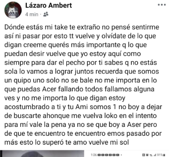 En su publicación, que ahora cobra un significado desolador, escribió: “Dónde estás mi take, te extraño (…) vuelve que yo estoy aquí como siempre para dar el pecho por ti (…) no voy a dejar de buscarte aunque me vuelva loco en el intento, para mí vale la pena… te amo, vuelve mi sol”.