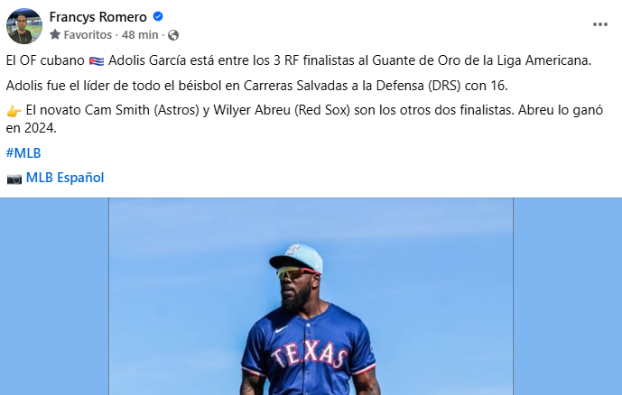 La élite defensiva de la Liga Americana de las Grandes Ligas cuenta con un representante cubano, luego de que Adolis García fuera nominado oficialmente como uno de los tres finalistas para obtener el prestigioso Guante de Oro en el jardín derecho.