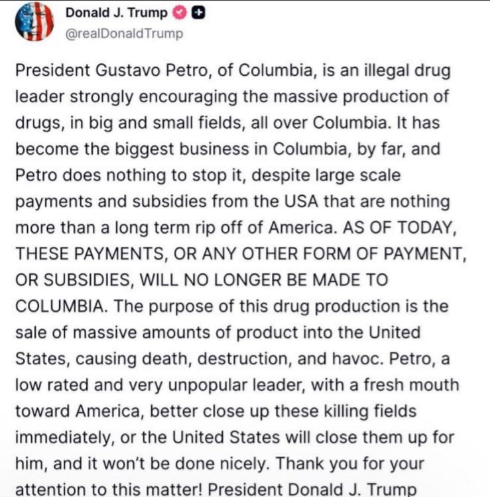 “El presidente colombiano Gustavo Petro es un líder del narcotráfico que incentiva la producción masiva de drogas, tanto en campos grandes como pequeños, por toda Colombia. Se ha convertido, con diferencia, en el mayor negocio de Colombia, y Petro no hace nada para detenerlo, a pesar de los pagos y subsidios a gran escala de EE. UU.”, manifestó el jefe de Estado norteamericano.