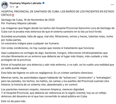 El cubano describió la situación como “un crimen sanitario silencioso” y afirmó que las condiciones reflejan el “colapso” del sistema de salud pública en la isla. “Los pacientes merecen respeto, limpieza y dignidad, y el Hospital Provincial, que debería ser referencia en la región oriental, hoy es un reflejo doloroso del desastre”, escribió el comunicador.