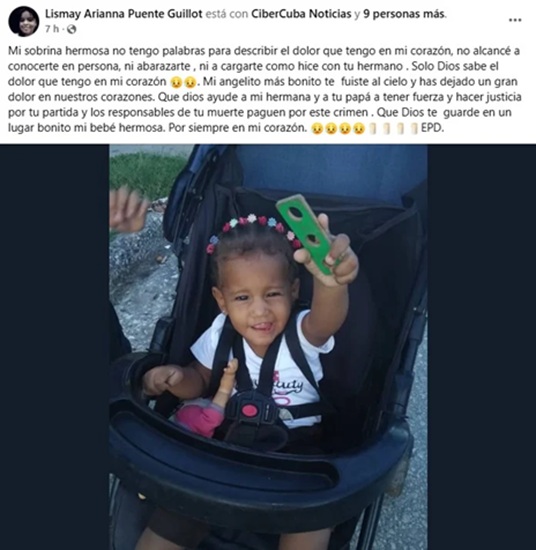 “Mi sobrina hermosa no tengo palabras para describir el dolor que tengo en mi corazón. No alcancé a conocerte en persona, ni abrazarte, ni a cargarte como hice con tu hermano”, escribió su tía, Lismay Arianna Puente, en una publicación.