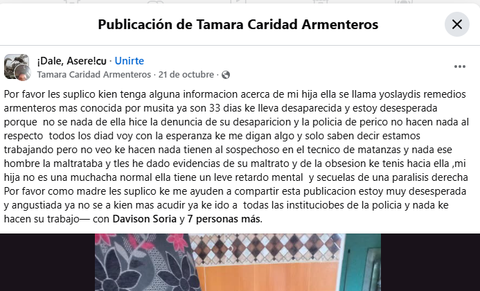 La denuncia sobre esta negligencia fue amplificada por el comunicador Niover Licea en su perfil de Facebook “Nio reportando un crimen”, agregando que Tamara Caridad Armenteros, madre de la desaparecida, ha estado viviendo un calvario desde entonces.