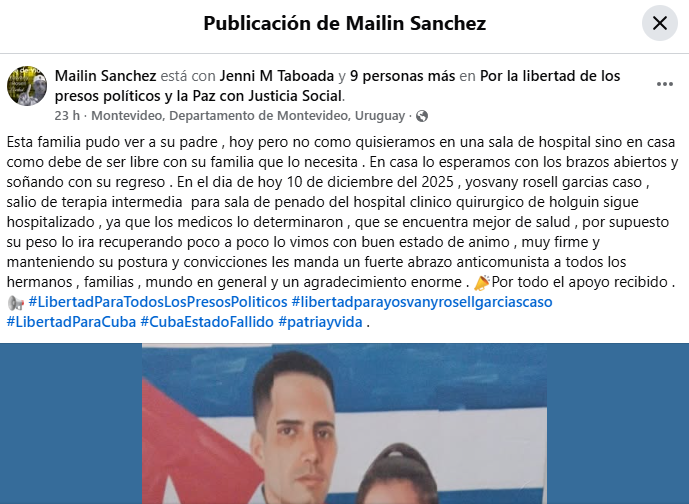 La cruel dictadura cubana finalmente autorizó una visita familiar al preso político Yosvany Rosell García, quien se recupera en un hospital de Holguín tras llevar su cuerpo al límite con una huelga de hambre de 40 días para protestar su encarcelamiento.