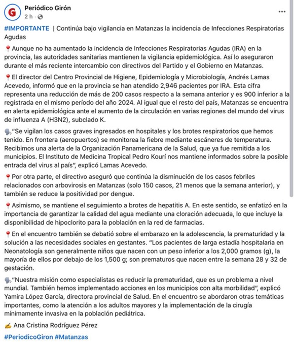 Según reportes oficiales, el virus comenzó a propagarse con fuerza en varios municipios matanceros, afectando especialmente a niños, ancianos y personas con enfermedades crónicas. Aunque el Ministerio de Salud Pública (MINSAP) confirmó la circulación del virus, la respuesta institucional es limitada, marcada por la escasez de medicamentos, la falta de insumos médicos y la sobrecarga de los centros hospitalarios.