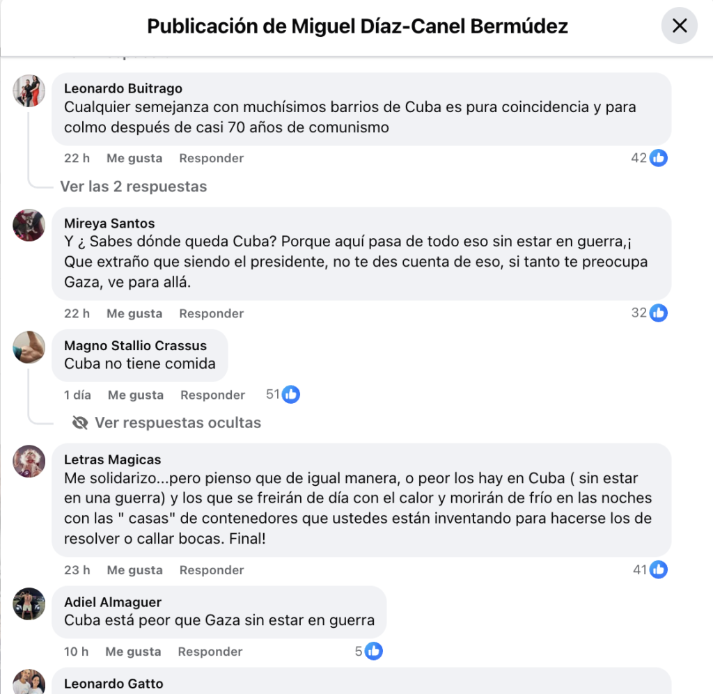 Entretanto, hubo algunos cubanos que considerando que la imagen de Gaza publicada por Díaz-Canel era similar a cualquier territorio dentro de la isla que se encuentra destruido, y no precisamente por una guerra, sino por el comunismo.