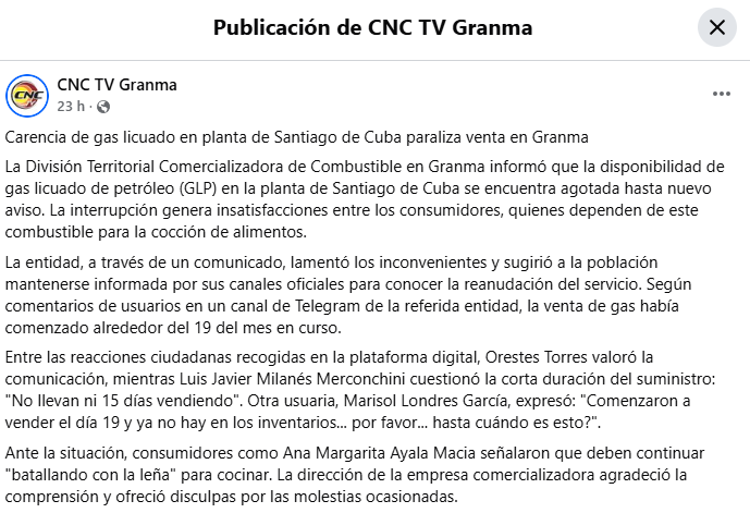 La información fue difundida por la División Territorial Comercializadora de Combustible mediante un comunicado replicado por el aparato de propaganda oficialista CNC TV Granma en la red social Facebook.