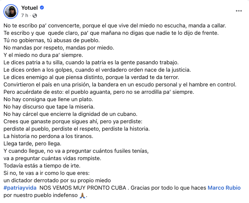 El texto concluye con un llamado directo a Díaz-Canel para que abandone el poder: “Todavía estás a tiempo de irte. Si no, te vas a ir como lo que eres: un dictador derrotado por su propio miedo”. Asimismo, el cantante agradece al secretario de Estado, Marco Rubio, por su apoyo al pueblo cubano.