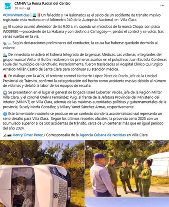 Un fatal accidente de tránsito en la autopista nacional de Villa Clara terminó con la vida de una persona y dejó 14 heridos, entre ellos todos los integrantes del grupo musical “Velito, el Bufón”, según confirmaron fuentes de los servicios de emergencia.
