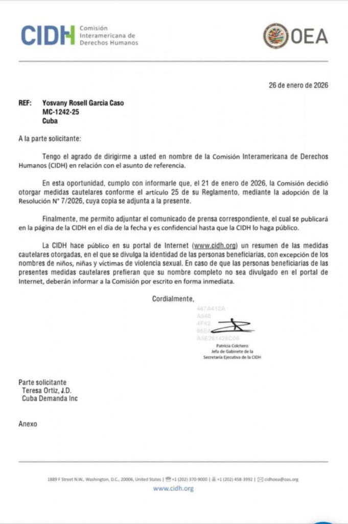 La decisión fue adoptada mediante la número 7/2026, en la que la CIDH concluyó que la información presentada demuestra que Rosell García Caso enfrenta amenazas a su vida, integridad personal y salud, particularmente debido a su delicado estado médico y a las condiciones de reclusión denunciadas por sus familiares y representantes legales.